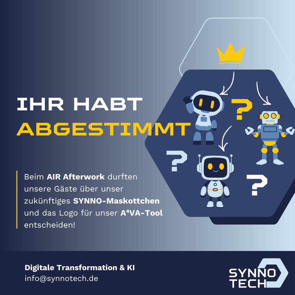 Beim AIR Afterwork durften sich unsere Gäste mit Klebepunkten in unsere internen Entscheidungsprozessen einbringen. Abgestimmt wurde über zwei Dinge: unser Maskottchen SYNNO und das Logo für unser A4VA-Tool. 🤖 Für die ganz kreativen Köpfe gab es sogar eine „Bau dir deinen Synno“-Station, bei der unsere Besucher selbst Hand anlegen durften. Co-Creation at its finest! 🎨 […]