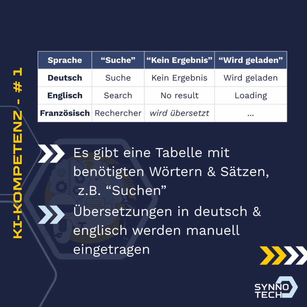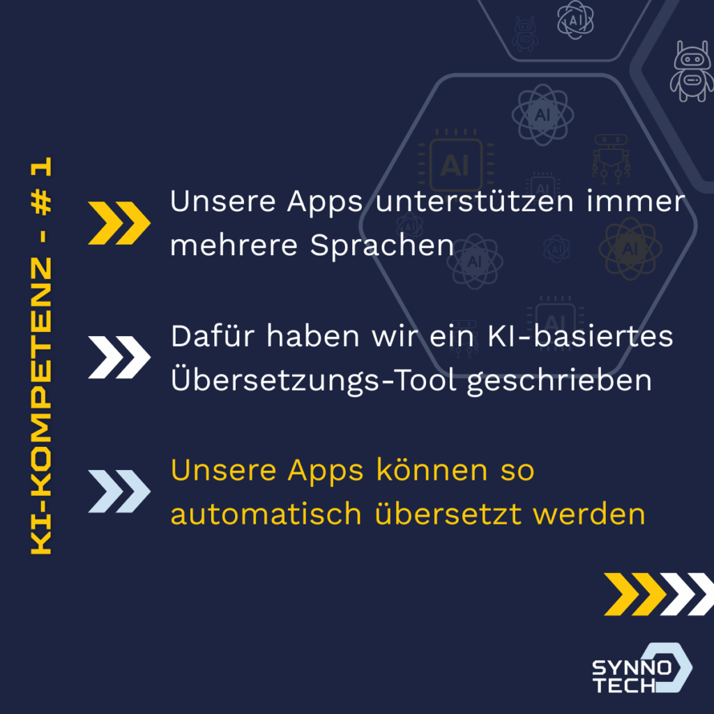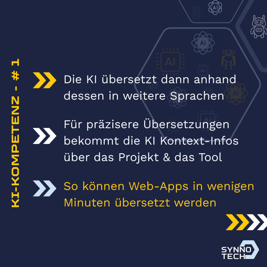 Deswegen haben wir ein KI-basiertes Übersetzungs-Tool entwickelt, mit dem innerhalb weniger Minuten ganze Applikationen übersetzt werden können. Die KI wird dabei auch mit Kontext-Informationen über die Anwendung und das Projekt gefüttert. So wird sichergestellt, dass immer die passendste Übersetzung im jeweiligen Zusammenhang verwendet wird