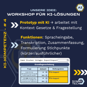 Dafür haben wir bereits vor einigen Jahren eine abgestimmte Prüfsoftware entwickelt. Im Rahmen eines KI-Workshops haben wir darauf basierend einen KI-Prototyp entworfen, der mit Hilfe des Kontextes (Gesetze & Fragestellung) arbeitet und den Wirtschaftsprüfer beim Schreiben unterstützen soll, z.B.: durch Spracheingabe, Transkription oder die Möglichkeit zur Zusammenfassung. 🤓